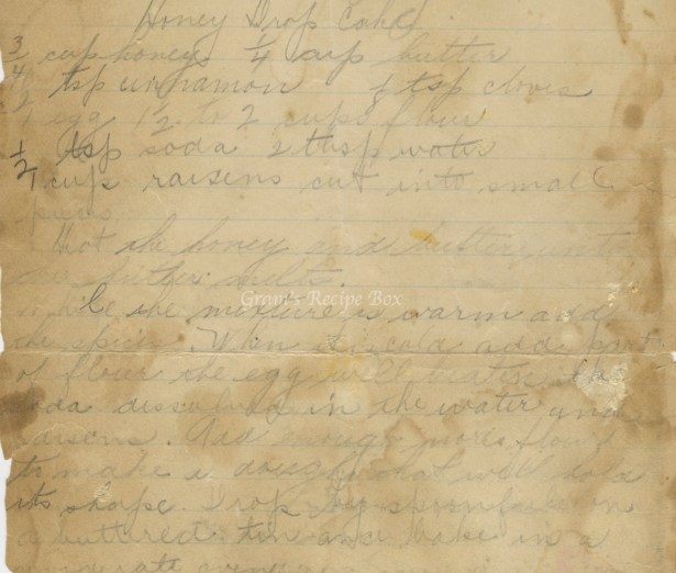 This recipe is called Honey Drop Cake, but it really sounds like muffins or cupcakes. It appears to be baked in buttered tins. I’m not 100% sure though. I found the exact recipe at another site and it was dated 1915. It came either from a book called Honey and its Uses in the Home, or from a Farmer’s Bulletin. It isn’t clear from that recipe if this should go into muffin tins or a cake tin, either. I’ll transcribe it as it appears, and then restructure the method to be a little more clear. If you should make this do let us know how it comes out!