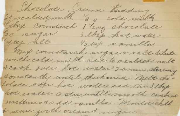Mix cornstarch, sugar & salt. Dilute with cold milk, add to scalded milk & cook over hot water 20 minutes stirring constantly until thickened. Melt chocolate over hot water, add the 3 Tbsp hot water & stir until smooth. Combine mixtures & add vanilla. Mould, chill, and serve with cream & sugar.