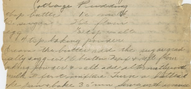 The name “cottage pudding” should also tell us that this is a recipe for every day people. Cottage meals were considered to be easier, made with ingredients common to hand, and could be found in nearly every cottage or farmhouse. The amount of butter varies widely from recipe to recipe and may be based on what the person had available to them. While this page of the book crumbled and I can’t see how much butter was called for, commonly it’s between 2 T to 1/4 pound (8 T).