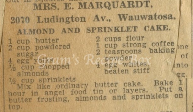 From Mrs E Marquardt of Wauwatosa, today we have Almond and Sprinklet Cake. Google and I both don’t know exactly what a “sprinklet” was. I wonder if it is an older name for sprinkles? There is a Norwegian word or place called “sprinklet” but even that is difficult to identify because it shows a big tower. Urban dictionary says that sprinklets are the tiny drops of water that splash on your windshield as you are driving. Let’s assume they are sprinkles, until evidence shows us otherwise.