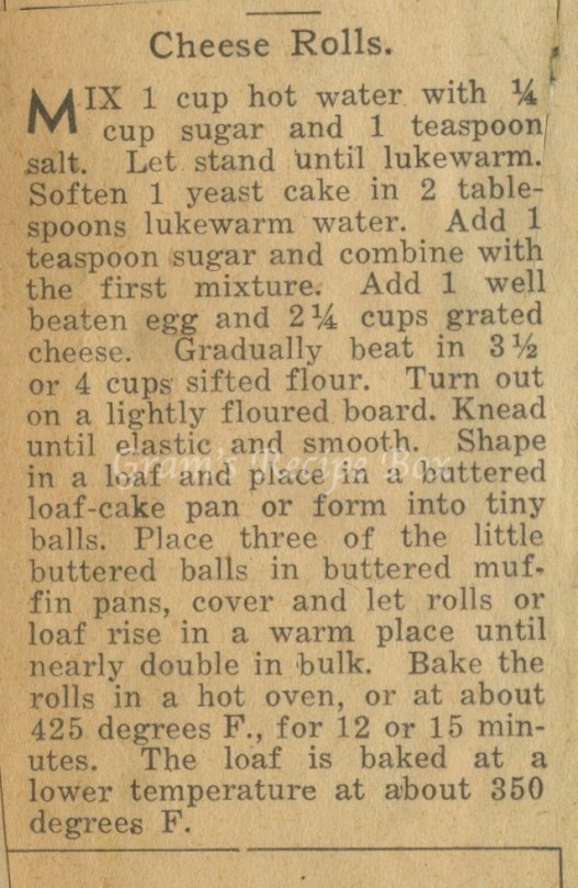 This recipe for cheese rolls sounds yummy and has a lovely technique for attractive rolls at the end. But first, let’s talk yeast. We have learned previously that yeast was a byproduct of beer making, and has been around for hundreds of years. Prior to the use of yeast, most bread was either a sourdough type or unleavened. The chemical reaction of the yeast rising in the proofing dough adds air to the dough, making it more soft and adding loft. In the past, yeast was available in cake form as well as dry. Today we can purchase dry yeast, cake yeast on occasion, packets of yeast, and even yeast formulated for your bread machine that is fast acting. Cake yeast, which this recipe calls for, is also called fresh yeast, or compressed yeast, and can still be purchased. It stays good for up to 10 days in the fridge, but it can be impacted by temperature fluctuation and that is why many people have moved to using dry yeast. Because this recipe calls for so much flour, I suspect the cake of yeast intended was a 2 oz cake. That would be equivalent to 2 1/4 tsp of dry yeast. I have linked to a wonderful website after the recipe that has a yeast conversion table to help you determine the right amount of dry yeast needed for your recipes.