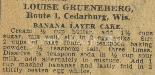 Cream butter and sugar well. Stir in egg yolks. Sift flour, baking powder and salt. (Modern flour is less likely to clump, so you don’t have to do it three times) Dissolve baking soda in sour milk. Add flour and milk mixtures to butter mixture a little bit at a time, alternating between flour and milk. Make sure it is all combined well. Add the mashed bananas. Finally add the stiffly beaten egg whites and gently combine, being careful not to knock out any loft.