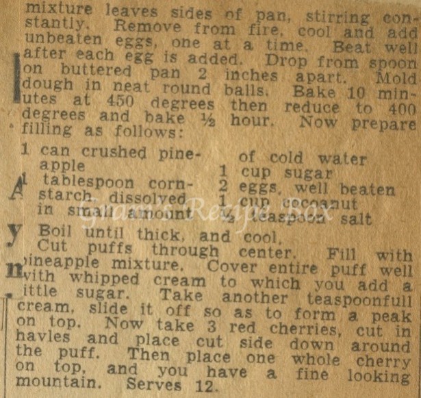This recipe for mountain snow puffs starts off with a choux base – meaning a cream puff. Next comes a filling of pineapple and coconut. The structure of the recipe is similar to our modern format, but the method reads a bit like your grandma is telling you over the phone what to do.