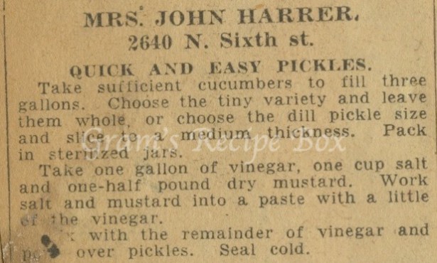 This pickle recipe has a short list of ingredients – cucumbers, vinegar, salt, dry mustard. I’m not sure if I would like these as I’m most familiar with dill pickles, but it could be interesting to try something different.