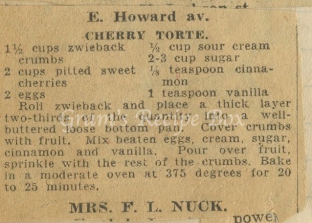 As we learned previously, a torte is a pretty layer cake. This one sounds like a lovely layer cake with a zwieback crust, a layer of cherries and then a creamy topping. You could sprinkle the top with cocoa powder or chocolate shavings for a gorgeous finish.