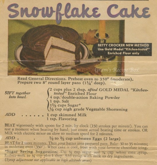 Here’s a clipping from a Betty Crocker leaflet – the type that were included with bags of flour. The leaflet generally included several recipes, baking tips, and usually a coupon for something like a piece of silverware. The “New Method” being referred to here is sift all the dry ingredients together, add your fat & liquids into the dry ingredients, then beat all together for 2 minutes. Finally, add the eggs. I have no idea if this is better, worse or no different from creaming butter & sugar first. The “General Directions” include bringing the ingredients to room temperature, flour sifted, all ingredients measured accurately, preheating the oven, preparing pans with grease and flour, and to scrape the batter from the sides of the bowl while mixing. These don’t seem like terribly novel instructions, but I suppose for a brand new baker they would be helpful.