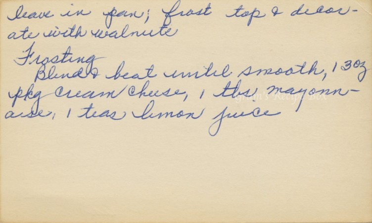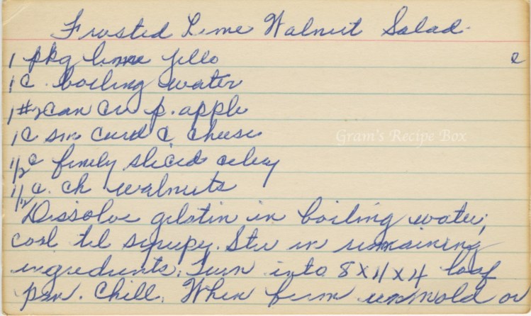 A lime jello dish. I really can’t say much about it because I don’t really like these, but I know they were tremendously popular. I can admit, they looked pretty when turned out on a plate of lettuce.