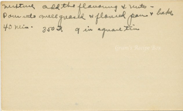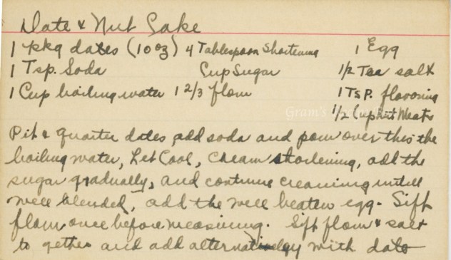 Pit a quarter dates, add soda and pour over this the boiling water, let cool, cream shortening, add the sugar gradually, and continue creaming until well blended. Add the well beaten egg. Sift flour once before measuring. Sift flour & salt together and add alternating with date mixture. Add the flavoring & nuts. Pour into well greased & floured pan & bake 40 min 350 F. 9″ square tin.