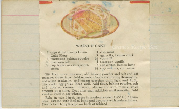 Bake in two 9-inch layers in moderate oven (375º F) 20 minutes. Spread with Boiled Icing and decorate with walnut halves.