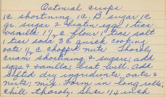 These are similar to oatmeal cookies, but the chilling of the dough and thin slicing will give you a nice, crispy cookie.