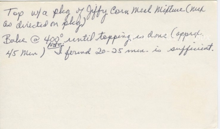 Using 9 inch square pan, place alternate layers of meat mixture & cheese in pan, ending with meat mixture. Top w/ a package of Jiffy corn meal mixture (used as directed on pkg) maybe cornbread? Bake @ 400º until topping is done (approx 45 min) Note: I found 20-25 is sufficient.