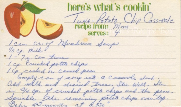 Who doesn’t like crushed potato chips on their tuna casserole? This is straight up mid-century comfort food.