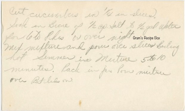 Ok, that’s a little confusing – slice cucumbers into 1/4″ slices. Make a brine of 1/2 cup salt & 1/2 gal water. Soak the slices in the brine 6 to 8 hours or over night. Drain the brine. Mix the sugar, mustard seed, celery seed, vinegar, water and pepper in a pot. Bring to a boil and then add the cucumber slices. Reduce heat and simmer 5 to 10 minutes. Ladle slices into jars, then top up the jars with the remaining hot liquid. Apply lids & preserve by preferred method.