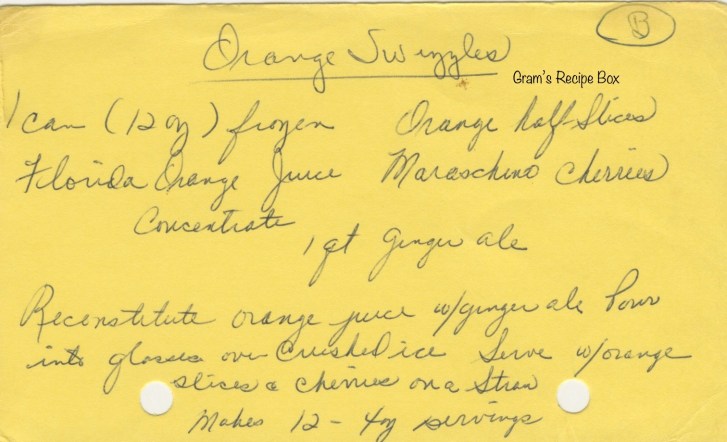 Reconstitute orange juice w/ ginger ale. Pour into glasses over crushed ice. Serve with orange slices & cherries on a straw. Makes 12 4 oz servings