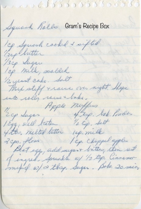 This might seem like a strange combination – squash rolls and apple muffins. I think these were recipes jotted in a small notebook for the cook to keep handy. The recipe on the back is Pancakes (My Recipe). Perhaps these were popular recipes in this family. There is very limited instruction, probably because the cook knew how to complete these recipes and the important part to her was the ingredients and basic method. I do this with recipes as well, jotting down just the ingredients. Might not be the best habit, honestly, because I am rather forgetful, haha. Sometimes I look at the notes later on and wonder how I cooked that list of ingredients.