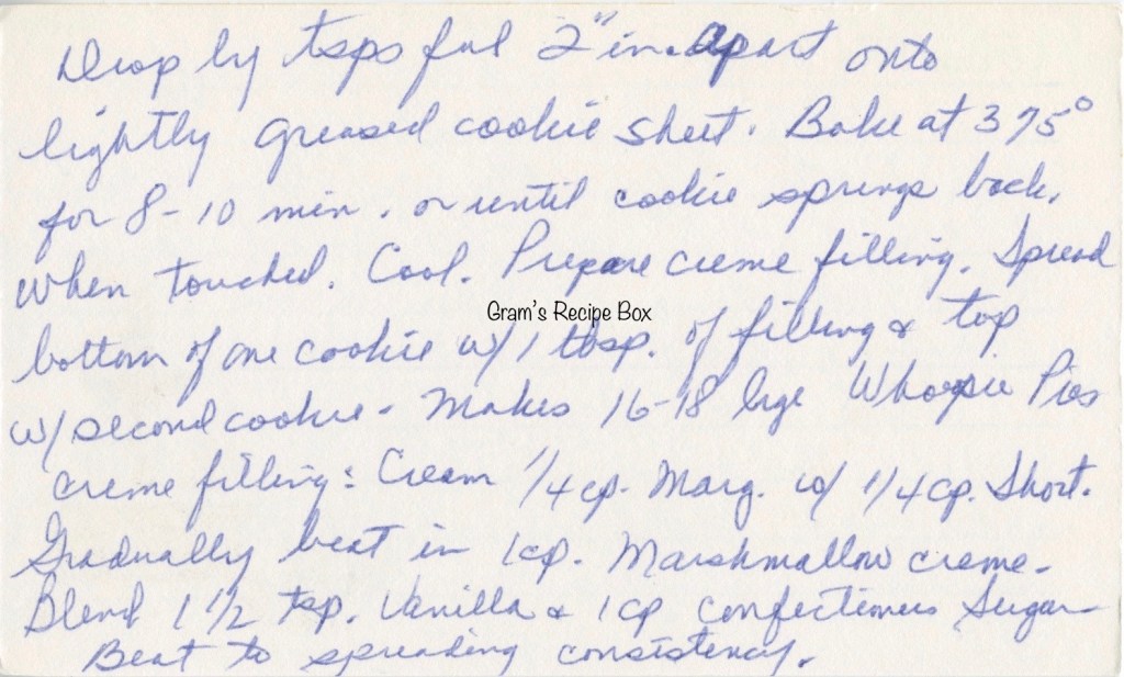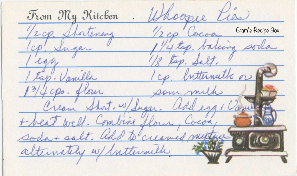 Mmmmm! Whoopie Pies! I confess, I didn’t have my first until 1998. They were made by a coworkers mother (he was young) and they were so good I made him get the recipe from her. Not a spec of marshmallow fluff in them! The filling is shortening and margarine and she made a note to ONLY use margarine. It would not “fluff” properly with butter. They do not need marshmallow fluff at all!