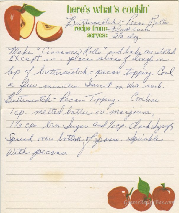 Make “cinnamon rolls” and bake as stated EXCEPT…place slices of dough on top of butterscotch pecan topping. Cool a few minutes. Invert on wire rack.