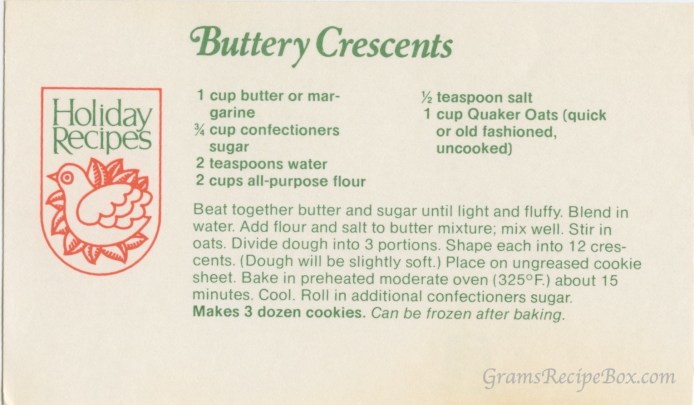 At first, I thought this recipe was for the airy croissant roll with laminated layers of dough, but instead, this is a cookie. I suspect my friend Diane B probably knows what they are as she is the holiday baking queen (at least when we were kids). There appear to be a number of variations available – from vanilla and pecan to almond and walnut. The type you make appears customizable to your tastes and may of course be influenced by “what Mom used to make” when you were a kid.