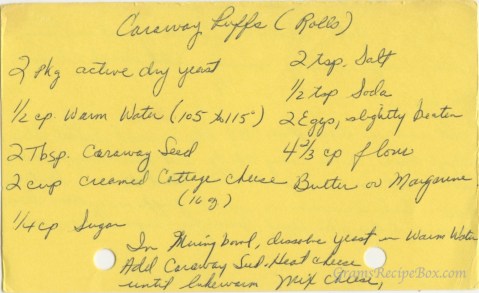 In mixing bowl, dissolve yeast in warm water. Add caraway seed. Heat cheese until lukewarm. Mix cheese, sugar, salt, soda & eggs in yeast mixture. Add flour gradually, mixing until dough cleans the bowl.