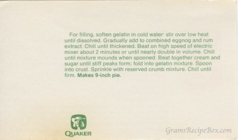 For filling, soften gelatin in cold water; stir over low heat until dissolved. Gradually add to combined eggnog and rum extract. Chill until thickened. Beat on high speed of electric mixture about 2 minutes or until nearly double in volume. Chill until mixture mounds when spooned. Beat together cream and sugar until stiff peaks form; fold into gelatin mixture. Spoon into crust. Sprinkle with reserved crumb mixture. Chill until firm. Makes 9-inch pie.