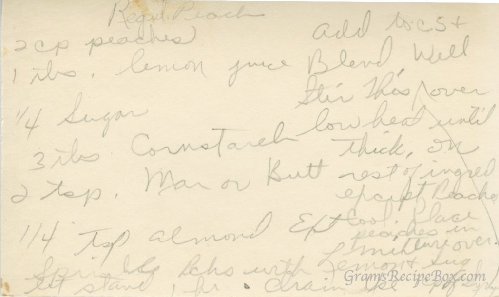 This recipe card is really messy – not because it has spills or stains on it, but because the author of the card was clearly disorganized. They could have gone onto the back of the card to write out the instructions, but instead crammed them on the front. She also indicated “over” at one point, but there’s nothing written on the back!