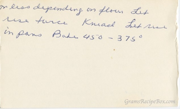 Another large quantity recipe – this one makes 6 loaves of whole wheat bread. Today, 6 loaves might be an awful lot for a small family, but for instance when my mother was a child in the 30s and 40s, Gram would bake bread every other day for their family of 5. A larger family would need even more bread. A homemaker supporting multiple generations might also want to make a larger batch, or even for a church or other civic organization. How would you use 6 loaves of bread today?