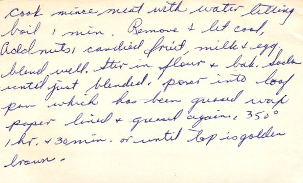 Cook mince meat with water, letting boil 1 minute. Remove and let cool. Add nuts, candied fruit, milk & egg. Blend well. Stir in flour & baking soda until just blended. Pour into loaf pan which has been greased wa paper lined & greased again. 350º 1 hour & 30 minutes or until top is golden brown.