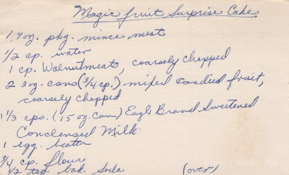 Any recipe that includes the word “magic” always makes me a bit nervous. Is this going to be one of those really difficult recipes that takes years to master just for a fancy reveal? No idea. I haven’t made this, but it appears to be a fruitcake/mince meat cake of some type.