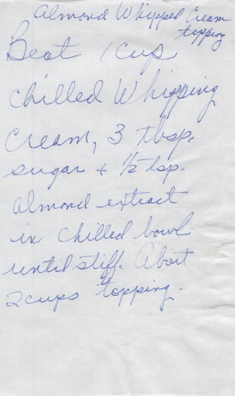 Beat 1 cup chilled whipping cream, 2 tbsp sugar & 1/2 tsp almond extract in chilled bowl until stiff. About 2 cups topping.