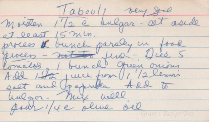 Process 1 bunch parsley in food processor – fine. Dice 5 tomatoes, 1 bunch green onions. Add juice from 1 1/2 lemon, salt & paprika. Add to bulgar. Mix well, pour 1/4 c olive oil.