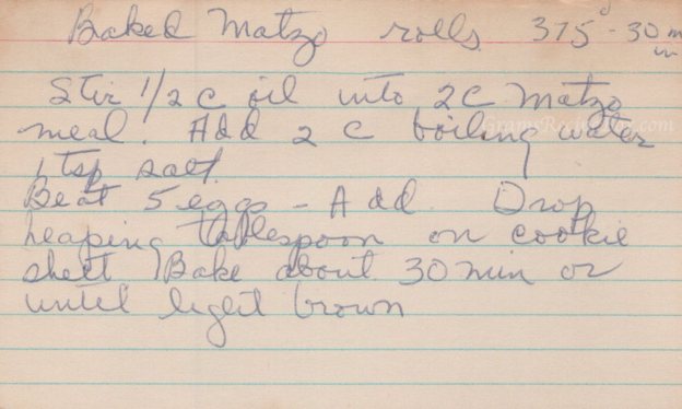 Kicking off a series of recipes that were filed as either Passover or Jewish in one of the collections I acquired, here is a recipe for Baked Matzo Rolls. I’m going to be learning about these traditional foods because I am not Jewish and I didn’t have a lot of exposure to Jewish foods before this. One thing I learned right off the bat is that matzo meal – which this recipe calls for – is made from crispy matzo ground into a flour-like consistency. Matzo flour is specially made from wheat, spelt, barley, rye or oat and follows specific rules in processing. Crispy matzo is made from matzo flour; matzo meal is made from crispy matzo. From what I can tell, these will be a rounded roll. Many photos show an X-shaped cut across the top of the rolls but I don’t know if that is required.
