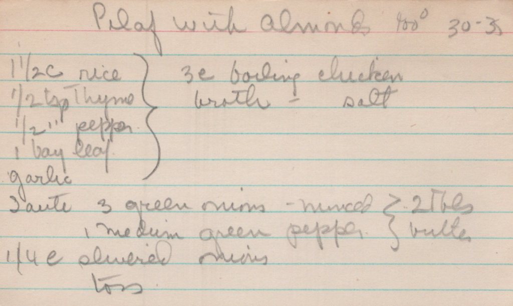Pilaf is typically a rice dish – sometimes made with wheat in place of rice – typified by cooking the rice with herbs in broth. Sometimes it has meat in it, sometimes it’s just the side dish. It is known for having grains that don’t really stick together and are light and fluffy. In America, you often find browned orzo in rice pilaf. this particular recipe is called Pilaf with Almonds, but there’s no reference to almonds beyond the title. At the very end of the card it says “slivered onions” but I suspect that’s incorrect and should be almonds.