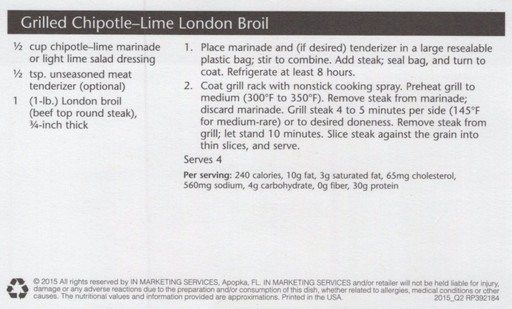 This one seems like it’s trying for a “south of the border” flair. I like chili-lime combinations, but I’m not fond of Chipotle chili, so I’d probably try a different flavor. The picture suggests lime wedges and grilled corn, both delicious. After slicing, you may want to serve with corn tortillas, black beans, and a mixture of diced onion & fresh chopped cilantro. Bonus points for this recipe, you can substitute any marinade and follow the directions for a nicely marinaded and grilled steak dinner.