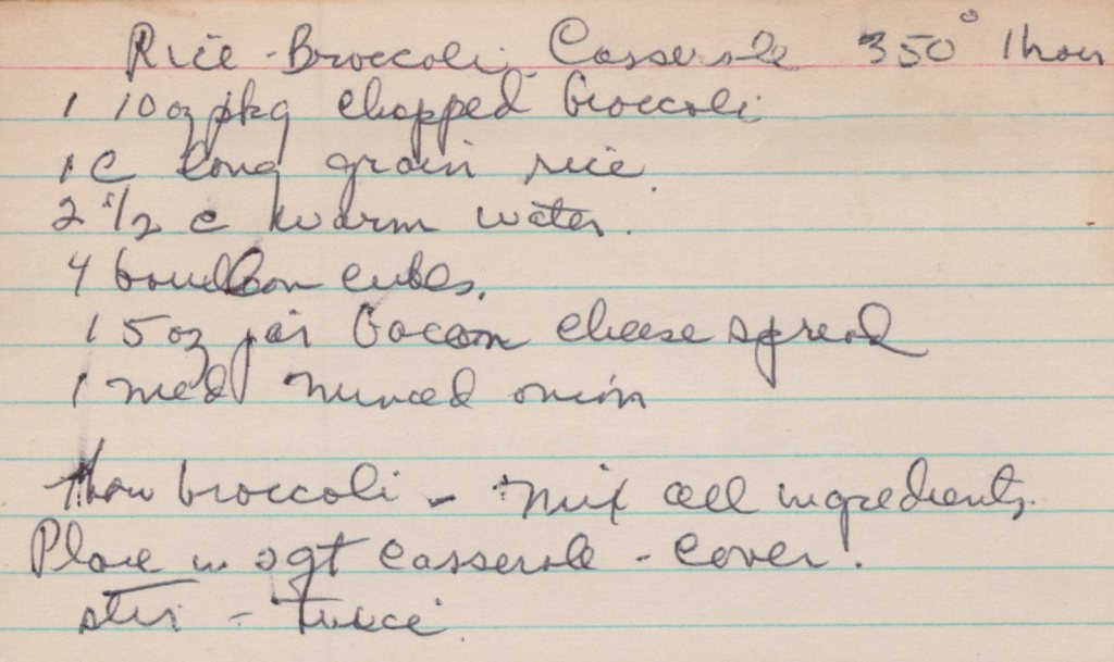 This is a simple side dish casserole. Use frozen broccoli and if you can’t find exactly 10 oz packages, you can just weigh it out and save the rest for another meal. I personally would chop the broccoli fine.