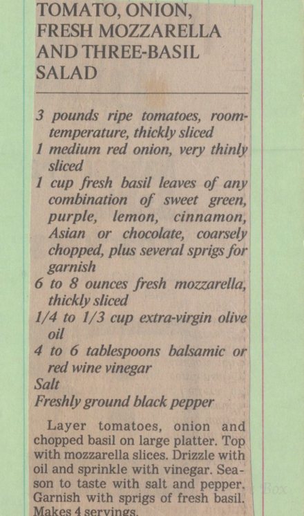 While this recipe has a long name – tomato, onion, fresh mozzarella and three-basil salad – this is a Caprese salad. Most recipes have variations – onions, capers, avocado… You can customize how you like it. Everything I have read says to use the freshest, most juicy tomatoes and fresh mozzarella – not the dry kind for shredding, but the wet kind for slicing. You can choose grape tomatoes, roma, whatever you like. Also, while the salad is prepared as a presentation in layers, you can easily toss it to make sure everyone gets a bit of everything.