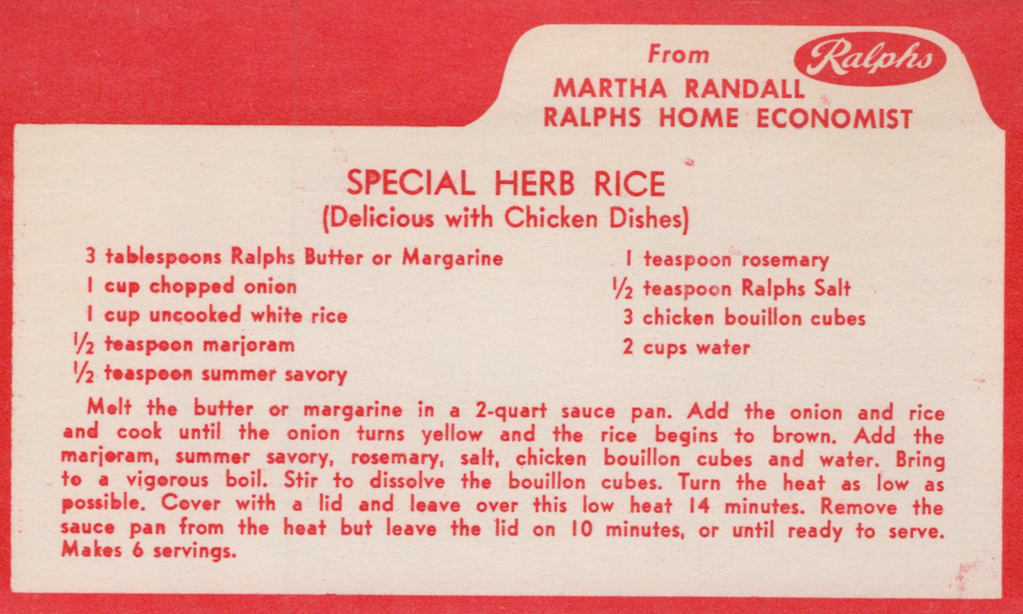 Pilaf is typically a rice dish – sometimes made with wheat in place of rice – typified by cooking the rice with herbs in broth. Sometimes it has meat in it, sometimes it’s just the side dish. It is known for having grains that don’t really stick together and are light and fluffy. In America, you often find browned orzo in rice pilaf. this particular recipe is called Pilaf with Almonds, but there’s no reference to almonds beyond the title. At the very end of the card it says “slivered onions” but I suspect that’s incorrect and should be almonds.